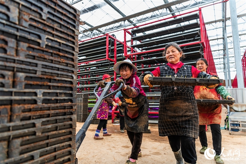 Workers cultivate early-season rice seedlings at an intelligent seedling breeding center in Hengshi town, Nankang district, Ganzhou, east China's Jiangxi Province. (People's Daily Online/Zhu Haipeng)