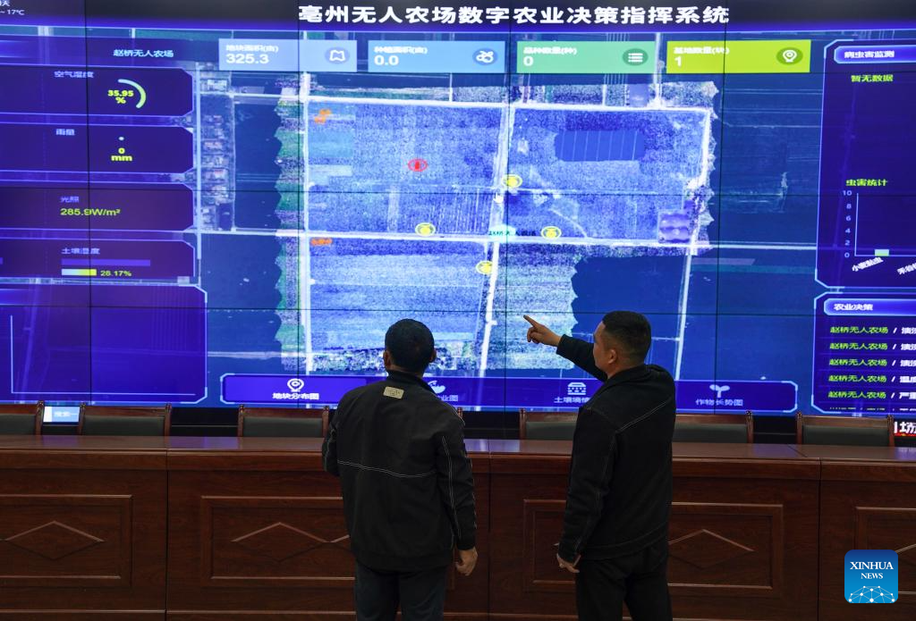 Jiao Rui checks the growth of the crops at his smart farm at Shuanglou Village, Bozhou City of east China's Anhui Province, March 19, 2024. By introducing IT technologies like Internet of Things, Big Data and Artificial Intelligence, Jiao Rui, a young farmer born in the 1990s, has set up a smart decision making system on his farm which greatly improved the production efficiency. (Xinhua/Du Yu)
