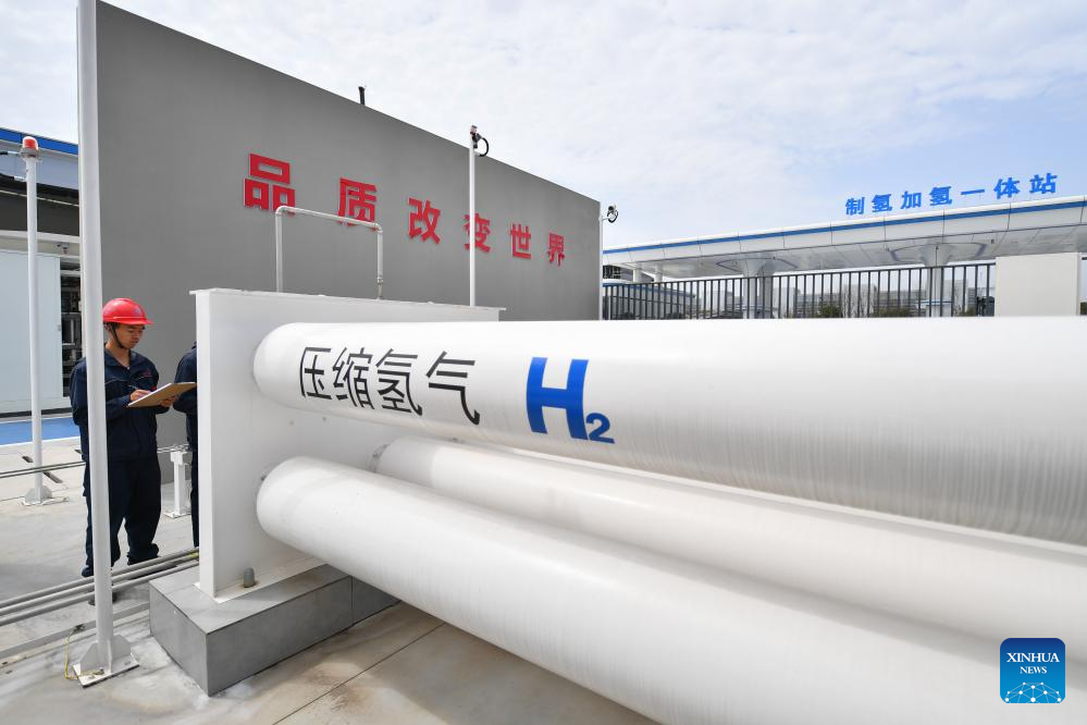 Staff workers inspect the storage area at the hydrogen production and distribution station of Sany Group in Changsha, capital of central China's Hunan Province, March 20, 2024. (Xinhua/Chen Zeguo)