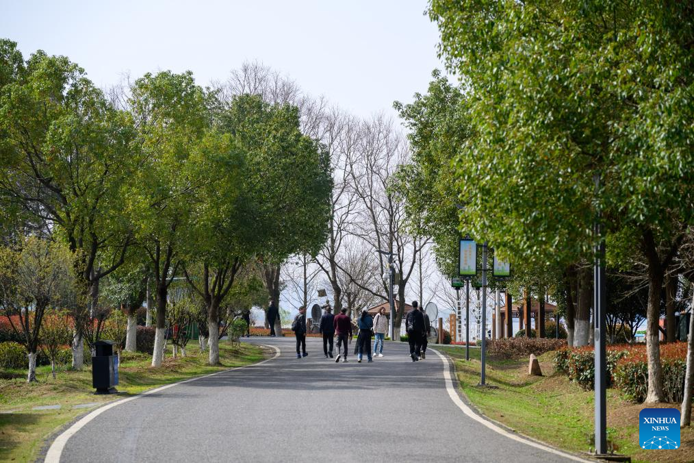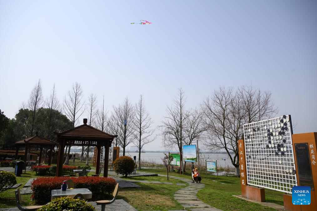 People visit Houguan Lake national wetland park in the Sino-French Wuhan Ecological Demonstration City in Wuhan, central China's Hubei Province, March 19, 2024. This year marks the 10th anniversary since China and France signed the agreement to build the Sino-French Wuhan Ecological Demonstration City. The eco city, covering an area of 39 square kilometers, has integrated Chinese and French ecological urban construction concepts and is rising as a popular region for residents and companies. (Xinhua/Hu Jingwen)