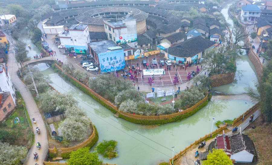 Aerial photo shows an earthen building complemented by the blossoms of bitter orange in Gezhu village of Nanjing county, Zhangzhou, southeast China's Fujian Province. (People's Daily Online/Li Changqian)