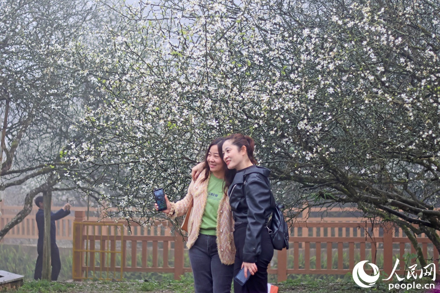Photo shows tourists strolling among the blossoms of bitter orange in Gezhu village of Nanjing county, Zhangzhou, southeast China's Fujian Province. (People's Daily Online/Li Changqian)