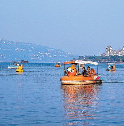 Tourists have fun in the Hanfeng Lake scenic area in Kaizhou district, southwest China's Chongqing Municipality. (Photo/Wang Xiaoyu)