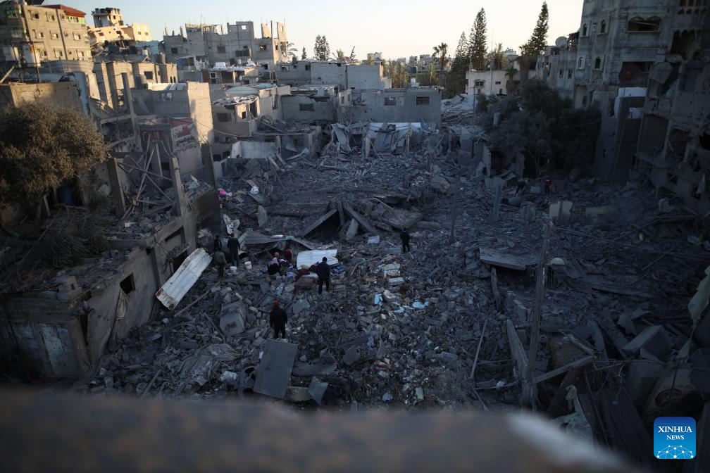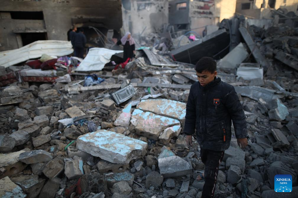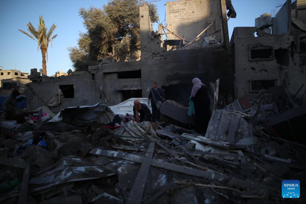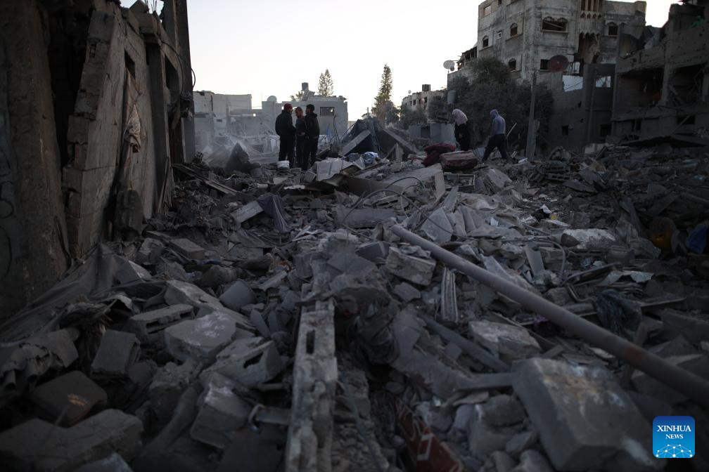People stand on the rubble after an Israeli airstrike in Maghazi refugee camp, central Gaza Strip, on March 21, 2024. The death toll from ongoing Israeli attacks on the Gaza Strip has risen to 31,988, the Hamas-run Ministry of Health in Gaza announced Thursday. (Xinhua)