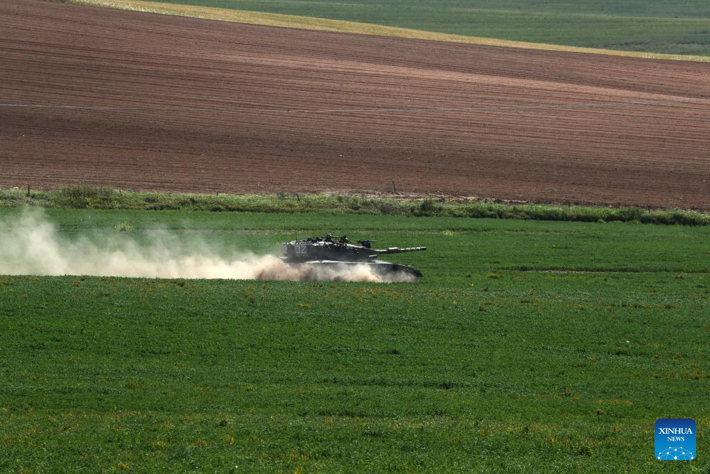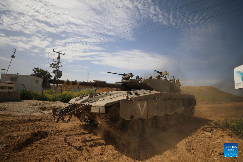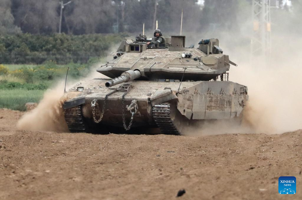 An Israeli tank maneuvers amid the ongoing Israel-Hamas conflict near Nir Am, a kibbutz in southern Israel, on March 21, 2024. the Hamas-run Ministry of Health in Gaza said Thursday in a statement that the Israeli army killed 65 Palestinians and wounded 92 others during the past 24 hours, bringing the total death toll to 31,988 and injuries to 74,188 since the Israel-Hamas conflict broke out on Oct. 7, 2023. Israel has been launching a large-scale offensive against Hamas in the Gaza Strip to retaliate against a Hamas rampage through the southern Israeli border on Oct. 7, 2023, during which about 1,200 people were killed and more than 200 were taken hostage. (Photo by Jamal Awad/Xinhua)