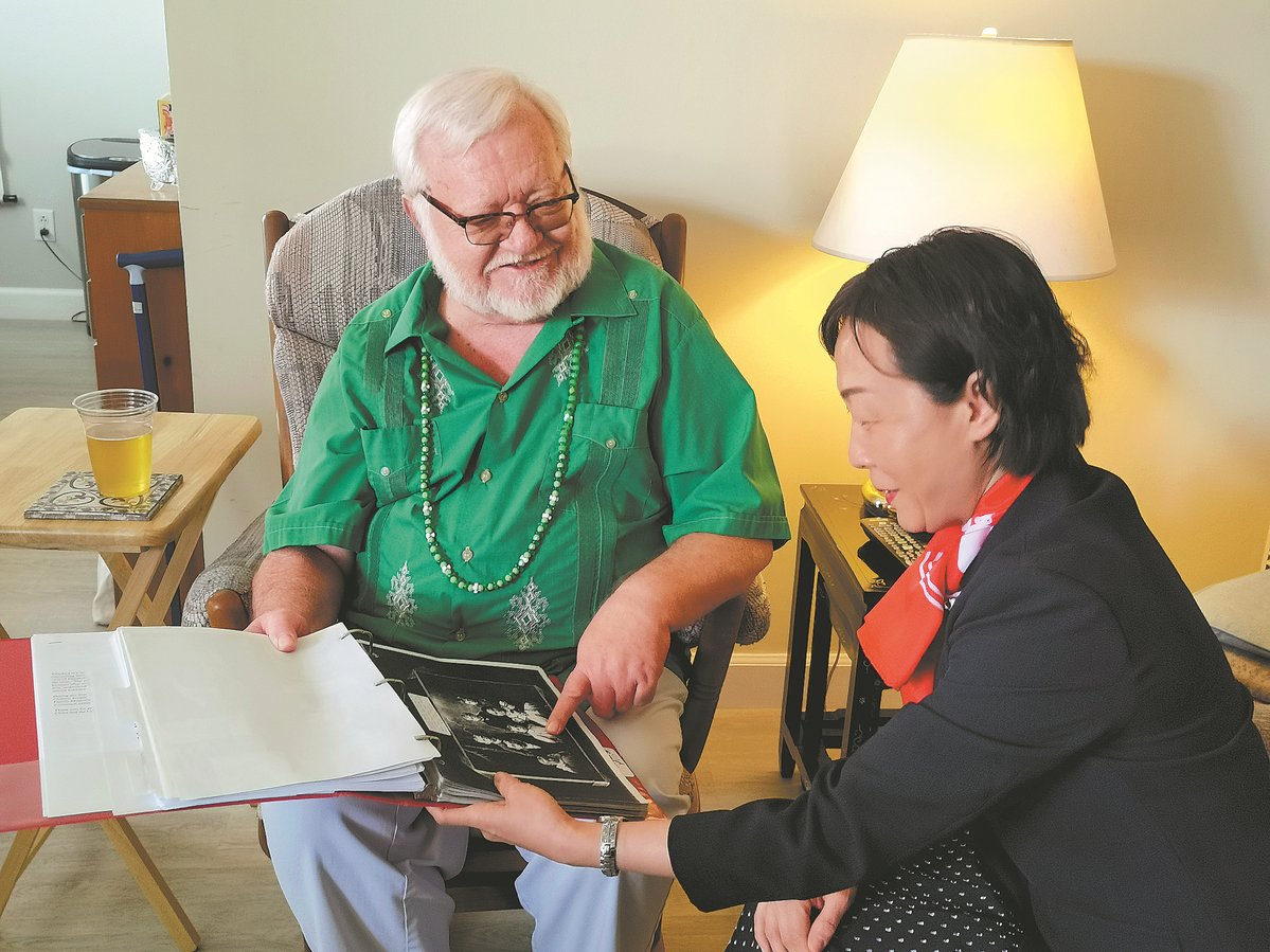 Lee Gardner (left) shows photographs of his family in Kuliang to Guo Ningning, vice-governor of Fujian province, on Sunday in El Segundo, California, in the United States. (Rena Li/China Daily)