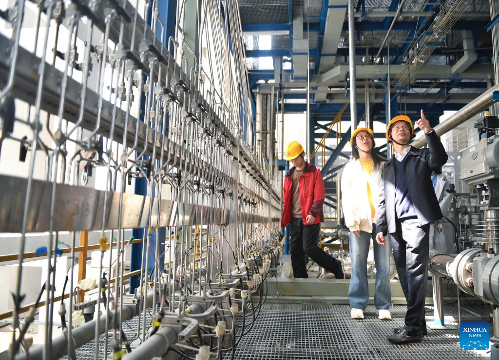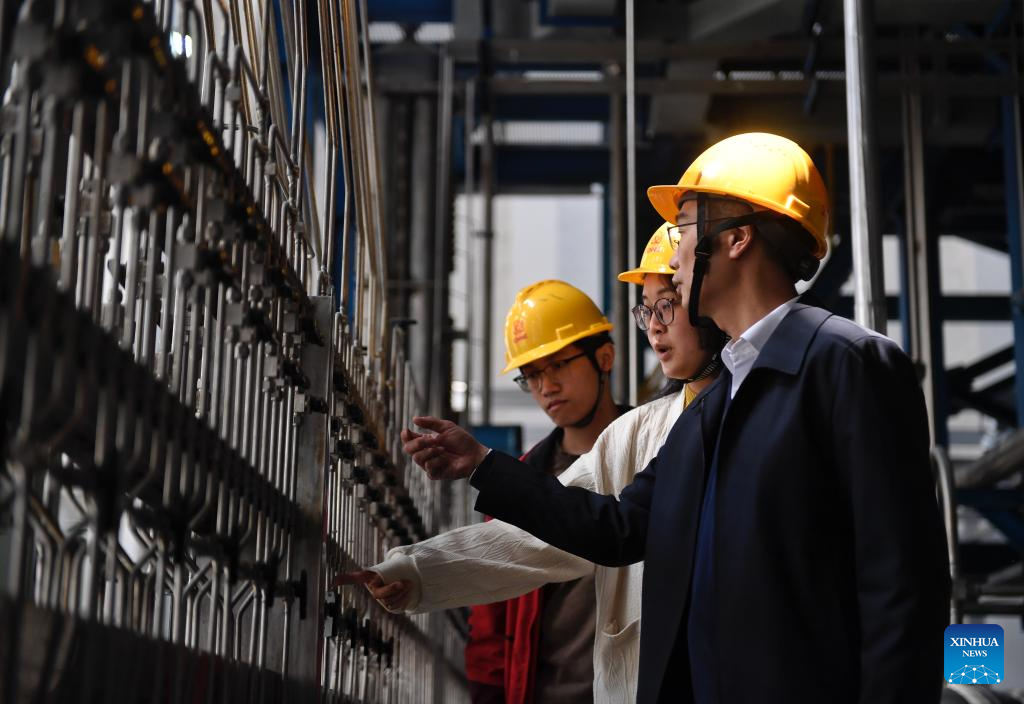 Song Danrong (R), chief designer of Linglong One, inspects with team members on an experimental platform for Linglong One, in Nuclear Power Institute of China in Chengdu, southwest China's Sichuan Province, March 14, 2024. The construction of Linglong One in Hainan Province has gone smoothly. (Xinhua/Liu Kun)
