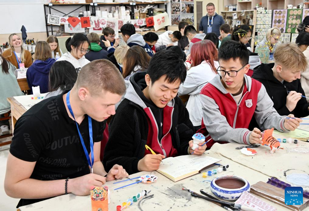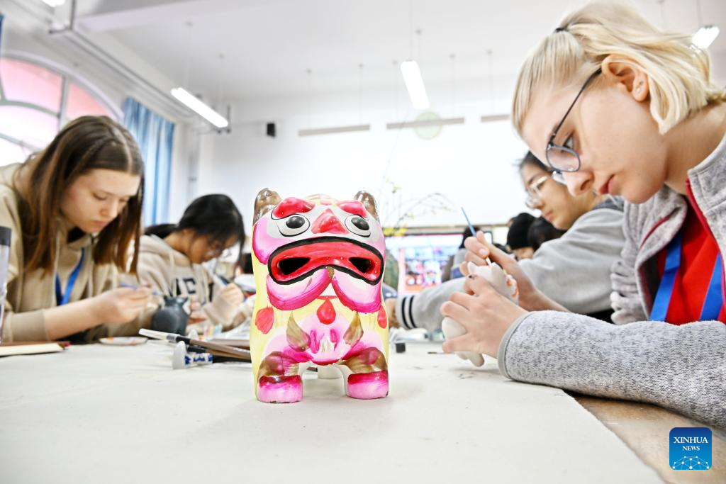 Chinese and German students experience painting "clay tiger" figurines in Qingdao No. 9 High School in Qingdao, east China's Shandong Province, March 21, 2024. High school students from Magdeburg of Germany, who paid a friendly visit to Qingdao No. 9 High School in Shandong Province, experienced making artworks of China's intangible cultural heritages and learned about traditional Chinese culture with Chinese students. (Xinhua/Li Ziheng)