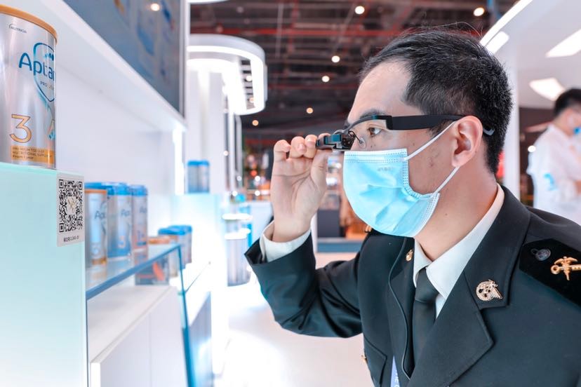 The Shanghai Customs for the first time launched inspection for exhibition halls and exhibits with new technologies such as augmented reality (AR) goggles and digital tags during the fourth China International Import Expo in 2021. Photo shows a customs officer checking the information of a milk powder product with AR goggles. (Photo from the official account of the publicity department of the Pudong New Area of Shanghai on WeChat)