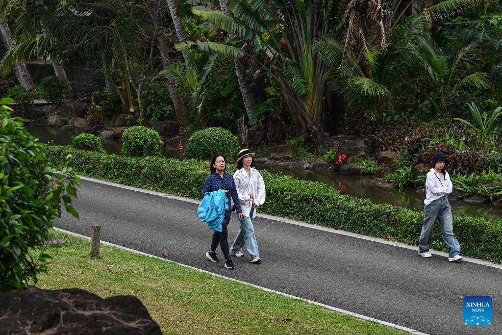 People visit Nanqiang Village of Boao Town in Qionghai, south China's Hainan Province, March 20, 2024. In recent years, Qionghai has built an exquisite array of rural clusters driven by Boao Forum for Asia and Boao Lecheng International Medical Tourism Pilot Zone. Nanqiang, Shamei, Mocun, Liuke and Dalupo villages have gradually become model villages of both local and international charm. (Xinhua/Pu Xiaoxu)