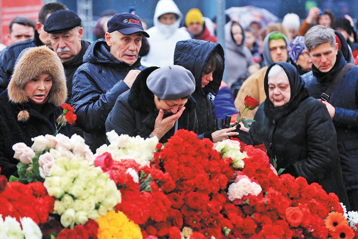 Moscow citizens lay flowers and mourn for victims at Crocus City Hall concert venue in the northwest of Moscow on Sunday, the day of which President Vladimir Putin announced as National Day of Mourning. REN QI/CHINA DAILY
