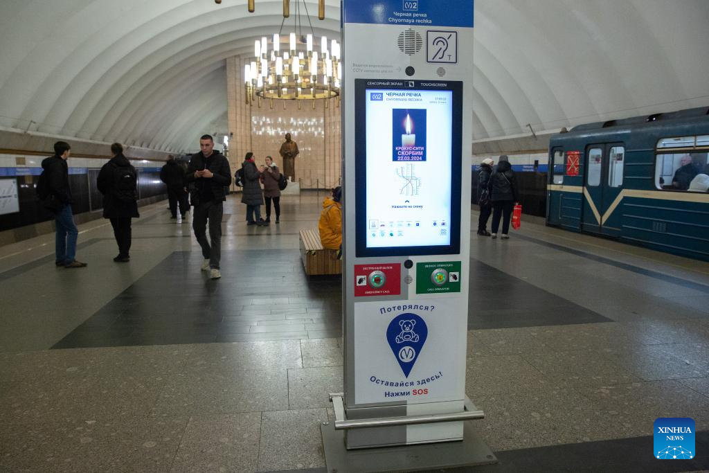 An electronic screen in St. Petersburg metro displays an image mourning for victims of Moscow terrorist attack in St. Petersburg, Russia, March 23, 2024. (Photo by Irina Motina/Xinhua)