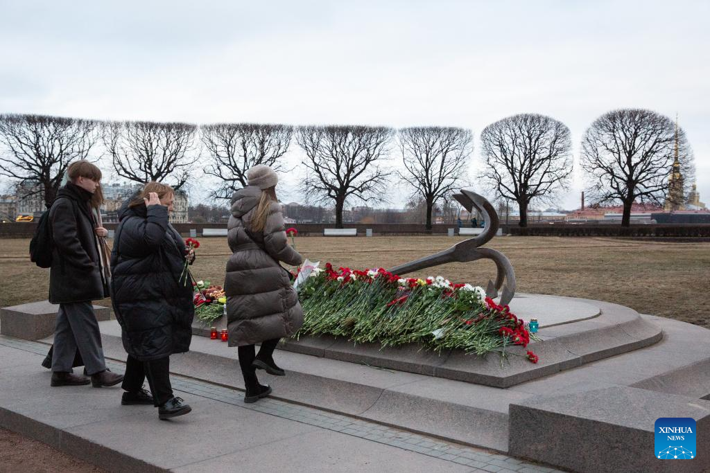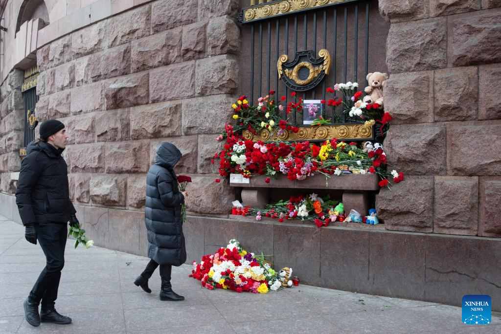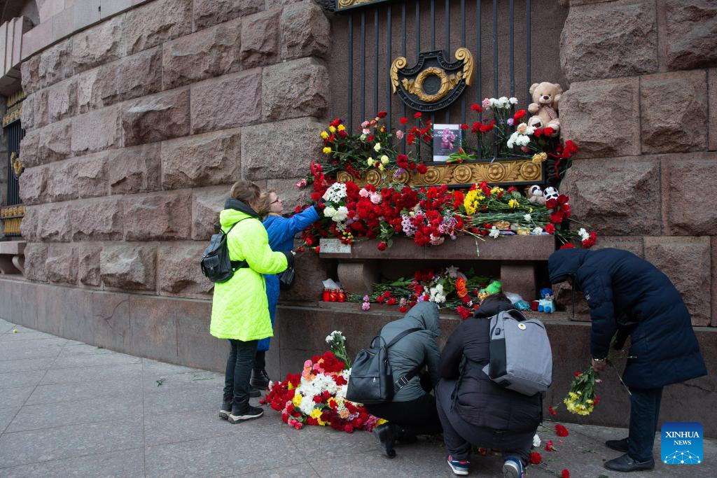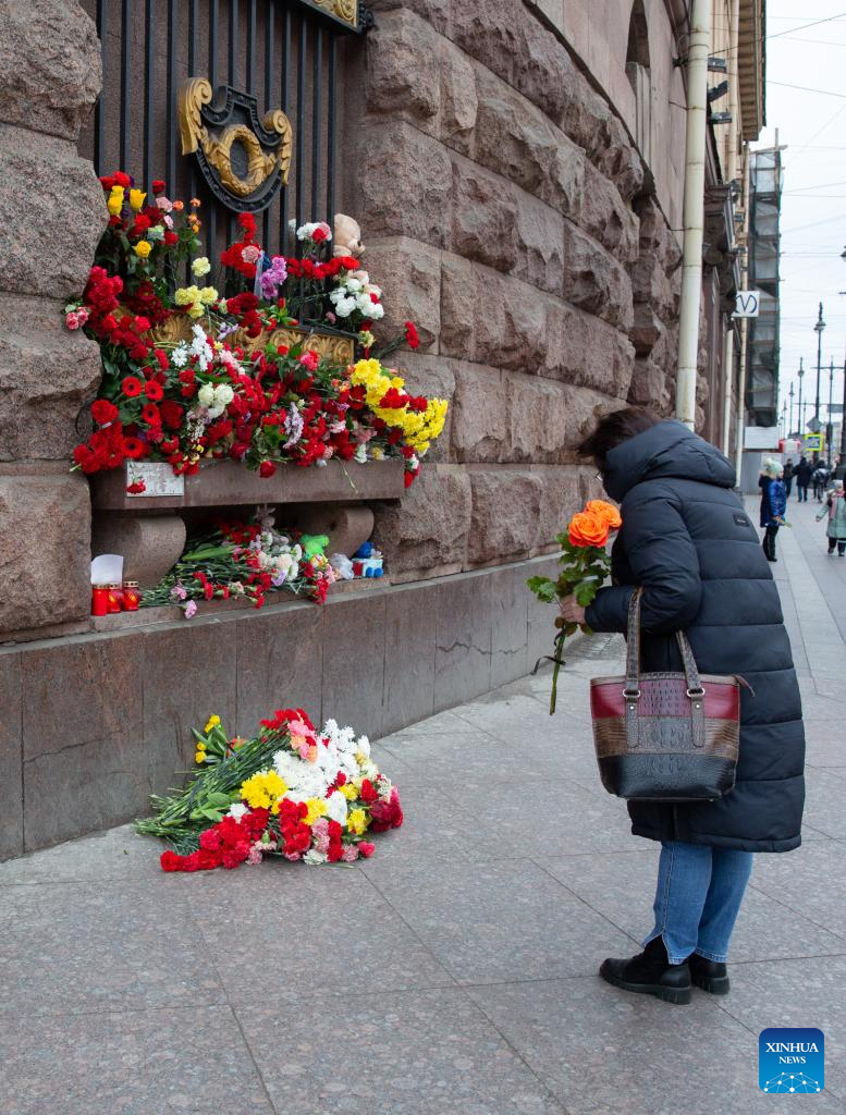 People lay flowers to commemorate victims of Moscow terrorist attack in St. Petersburg, Russia, March 23, 2024. (Photo by Irina Motina/Xinhua)
