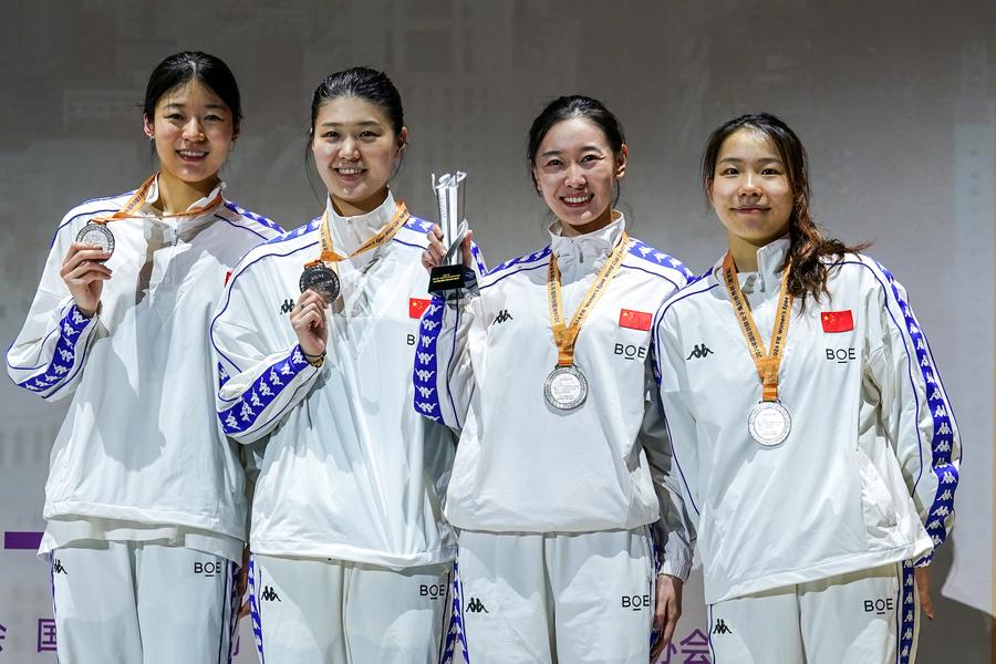 Chinese fencers Yu Sihan, Xu Nuo, Sun Yiwen and Tang Junyao (L to R) pose for photos at the award ceremony. (Xinhua/Li Bo)