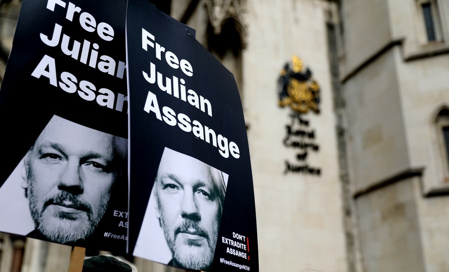 Signs showing support for WikiLeaks founder Julian Assange are seen in a protest outside the High Court in London, Britain, on March 26, 2024. (Xinhua/Li Ying)