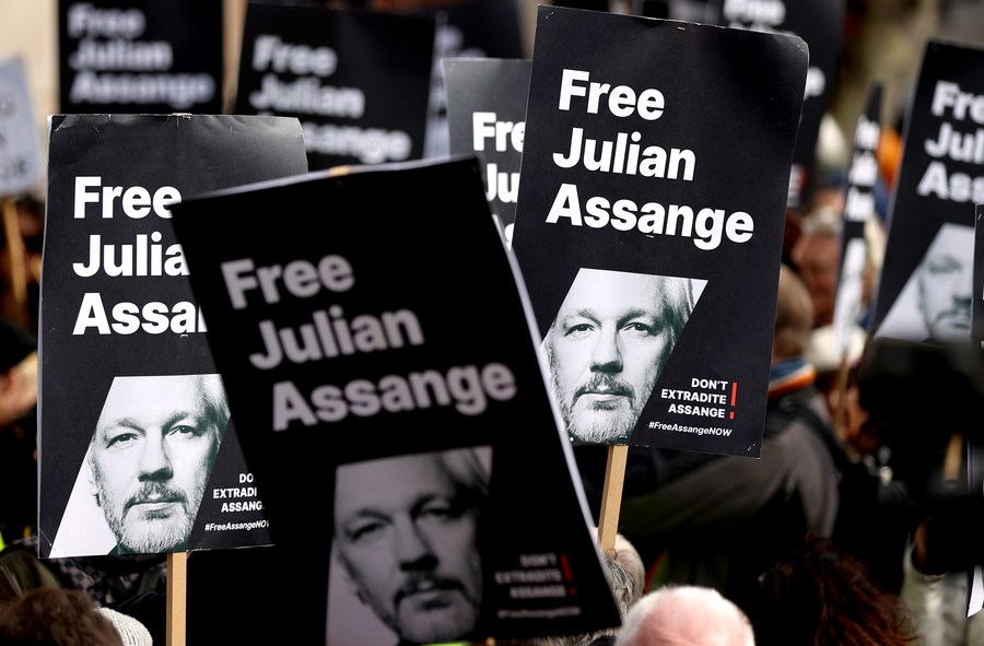 Supporters of WikiLeaks founder Julian Assange take part in a protest outside the High Court in London, Britain, on March 26, 2024. (Xinhua/Li Ying)
