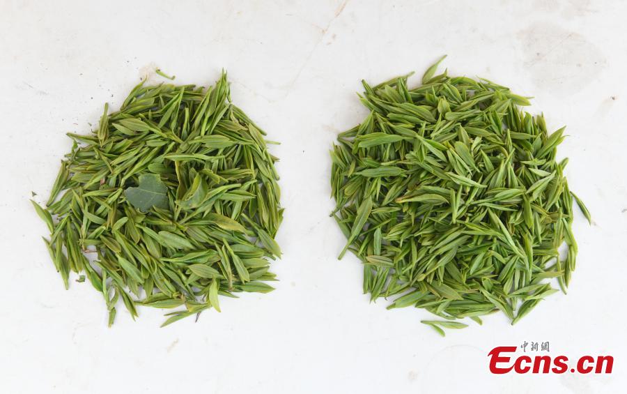 Combination picture shows tea leaves picked by a robot (L) and by a staff member at a tea plantation in Hangzhou, east China's Zhejiang province, China, March 26, 2024. (Photo: China News Service/Wang Gang)