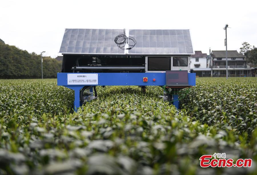 The AI tea picking robot was put into use in a tea garden. With a sun hat made of solar panels, a tea-picking robot weaved through rows of Longjing tea bushes in Hangzhou.
