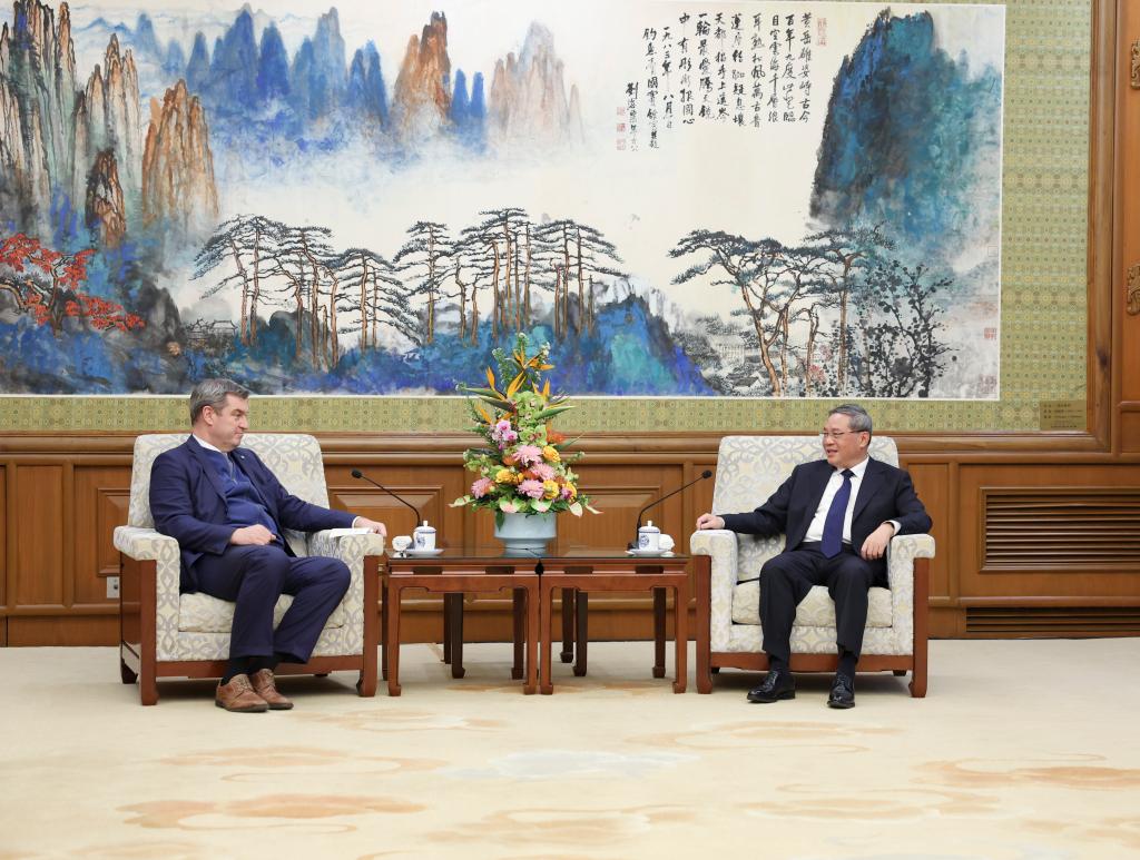 Chinese Premier Li Qiang meets with Markus Soeder, minister-president of Bavaria, Germany, at the Diaoyutai State Guesthouse in Beijing, capital of China, March 27, 2024. (Xinhua/Ding Haitao)