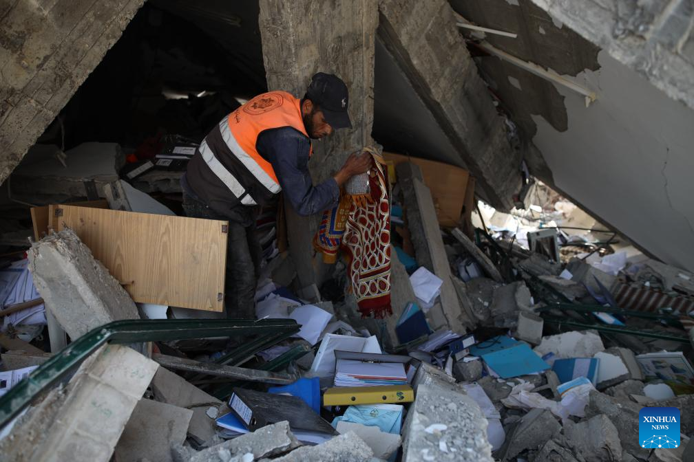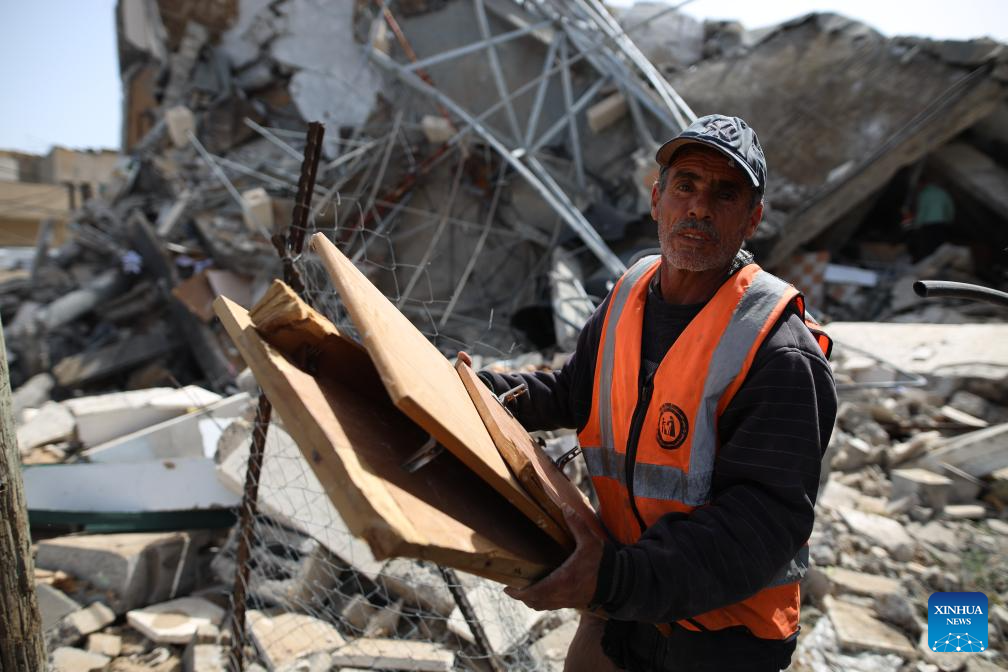 A man collects items after Israeli strikes in the town of al-Zawaida in central Gaza Strip, on March 27, 2024. The Palestinian death toll from ongoing Israeli attacks has risen to 32,490, the Hamas-run Health Ministry said on Wednesday. (Xinhua)