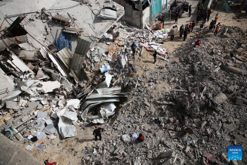 People search among the rubble of a building destroyed in an Israeli airstrike in the southern Gaza Strip city of Rafah, on March 27, 2024. The Palestinian death toll from ongoing Israeli attacks has risen to 32,490, the Hamas-run Health Ministry said on Wednesday. (Photo by Khaled Omar/Xinhua)