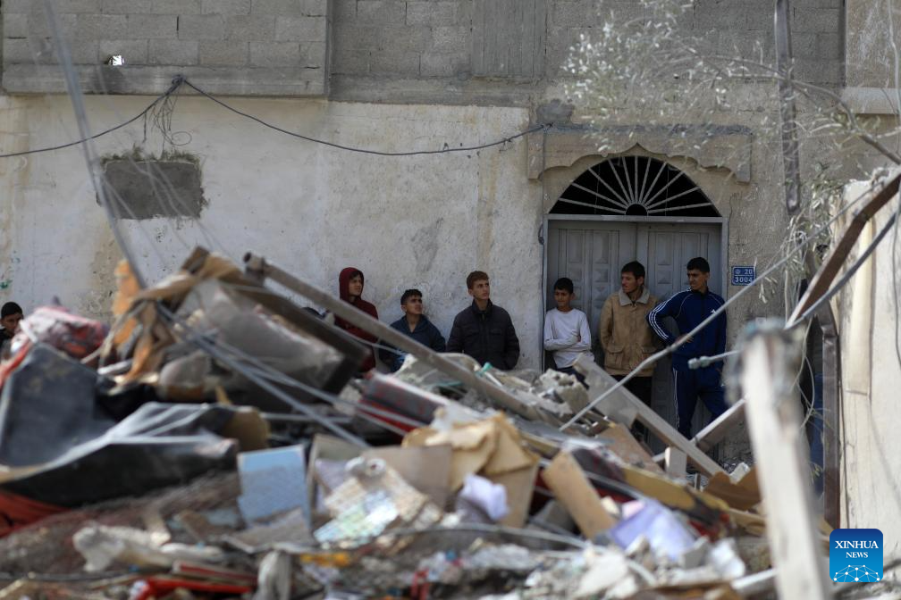 People are seen at a building destroyed in an Israeli airstrike in the southern Gaza Strip city of Rafah, on March 27, 2024. The Palestinian death toll from ongoing Israeli attacks has risen to 32,490, the Hamas-run Health Ministry said on Wednesday. (Photo by Khaled Omar/Xinhua)