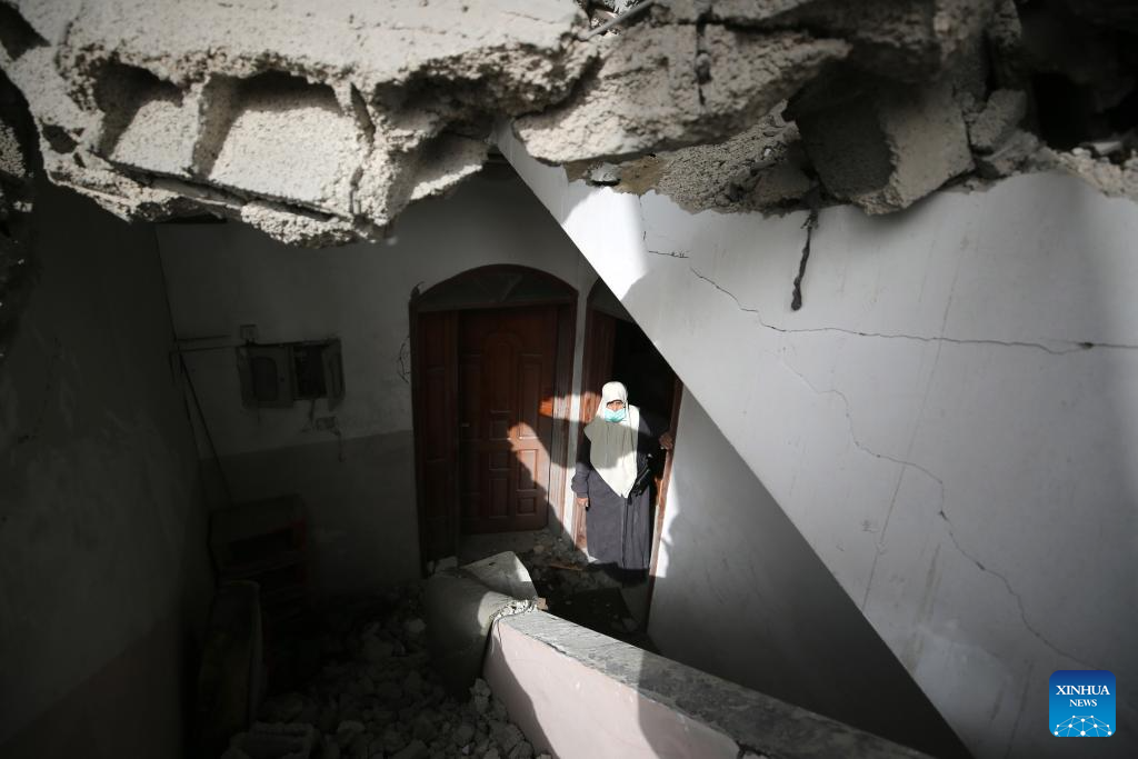 A woman stands inside a destroyed building after an Israeli airstrike in the southern Gaza Strip city of Rafah, on March 27, 2024. The Palestinian death toll from ongoing Israeli attacks has risen to 32,490, the Hamas-run Health Ministry said on Wednesday. (Photo by Yasser Qudih/Xinhua)