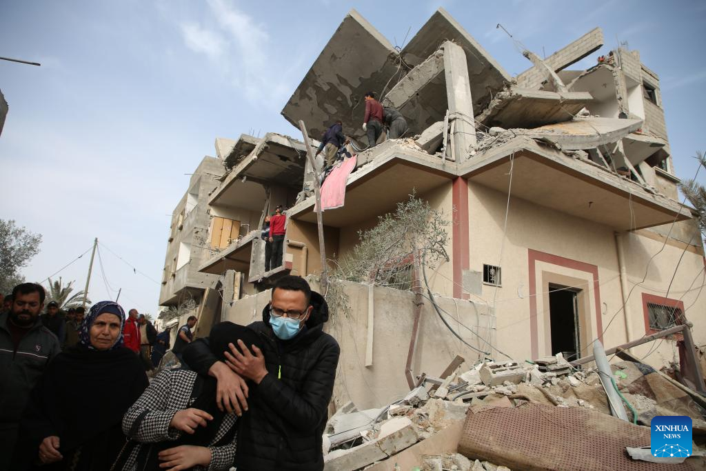 People conduct rescue work after an Israeli airstrike in the southern Gaza Strip city of Rafah, on March 27, 2024. The Palestinian death toll from ongoing Israeli attacks has risen to 32,490, the Hamas-run Health Ministry said on Wednesday. (Photo by Khaled Omar/Xinhua)