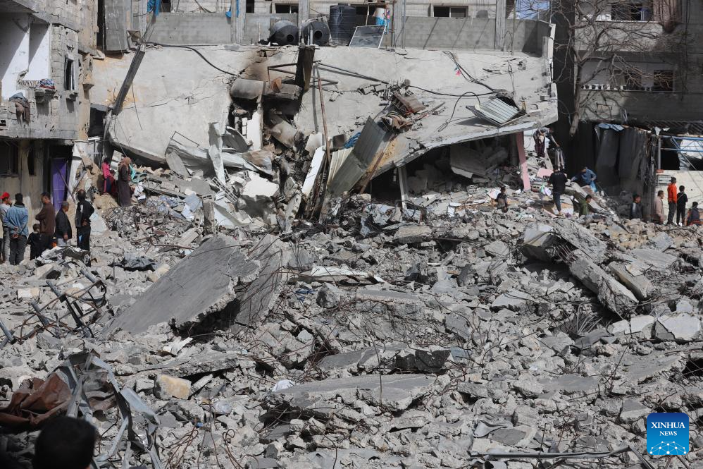 People gather around a destroyed building after an Israeli airstrike in the southern Gaza Strip city of Rafah, on March 27, 2024. The Palestinian death toll from ongoing Israeli attacks has risen to 32,490, the Hamas-run Health Ministry said on Wednesday. (Photo by Yasser Qudih/Xinhua)