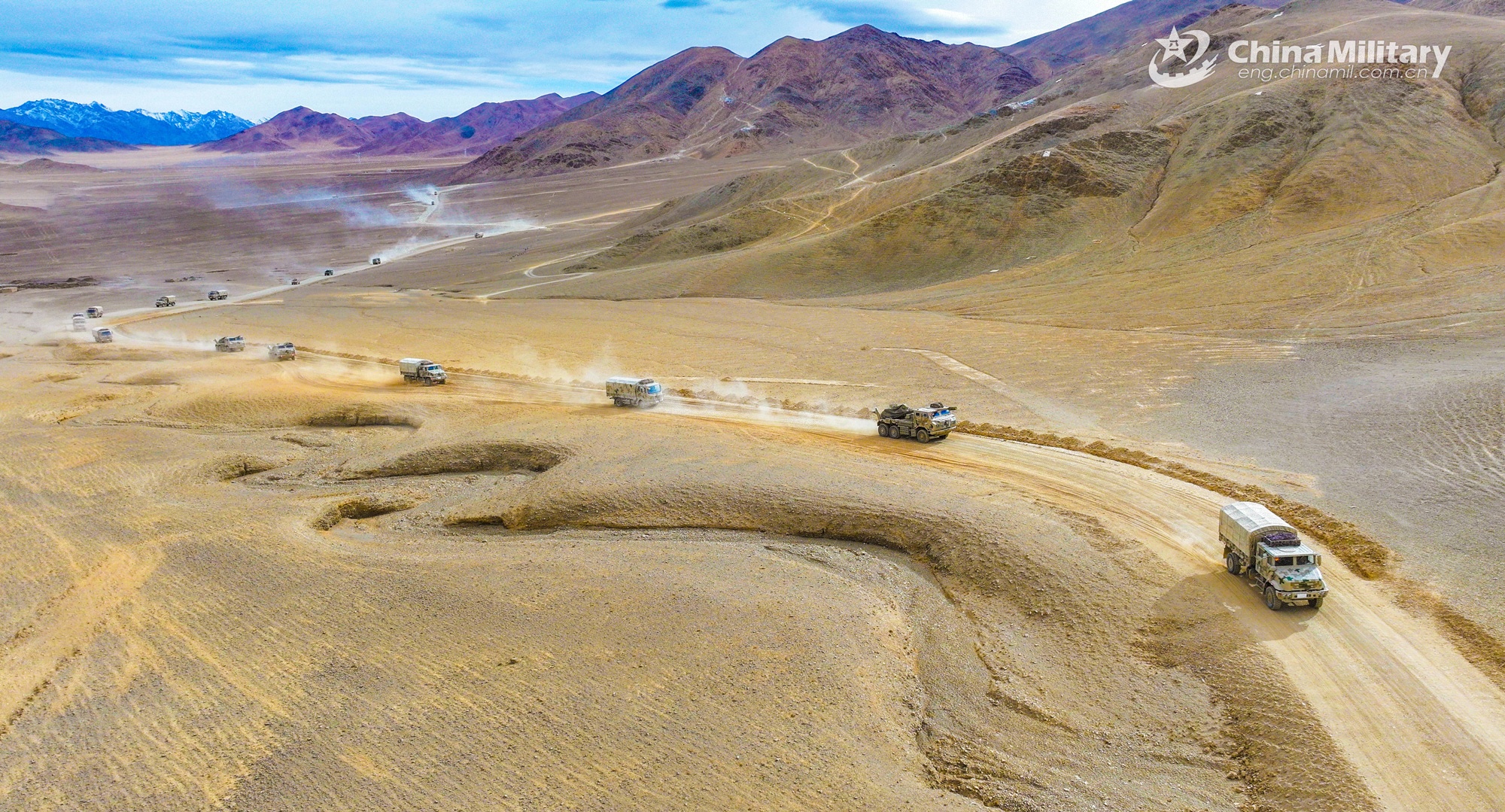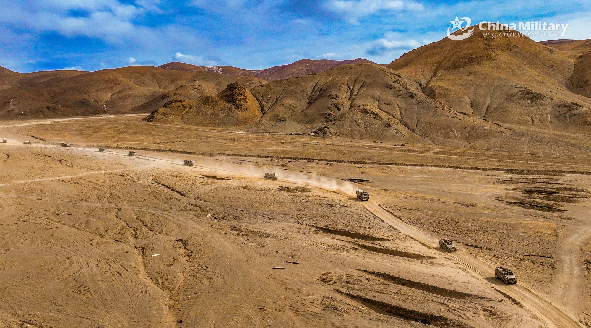 A convoy of military trucks attached to a regiment under the PLA Army is en route to a designated training field during a driving skill training exercise in desert area on March 14, 2024. (eng.chinamil.com.cn/Photo by Shang Luhang)