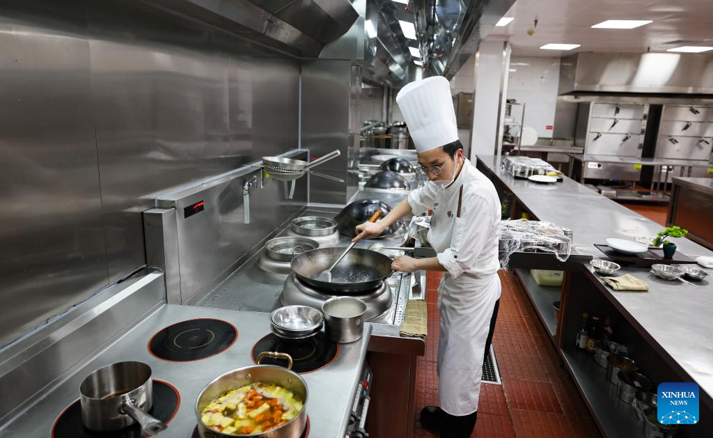 A chef cooks with an electric stove at a renovated kitchen at Boao Forum for Asia hotel in the Boao near-zero carbon demonstration zone in Boao, south China's Hainan Province, March 25, 2024. The Boao near-zero carbon demonstration zone was put into operation before Boao Forum for Asia (BFA) Annual Conference 2024.
