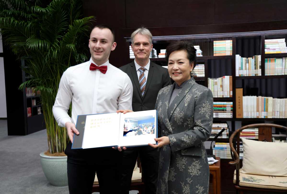Peng Liyuan, wife of President Xi Jinping, encouraged members of Germany's Burg Chinese Chorus on Thursday to continue to use music as the "golden key" to unlock a new world of Chinese language and experience the charm of Chinese culture through beautiful songs, as they did 10 years ago.
