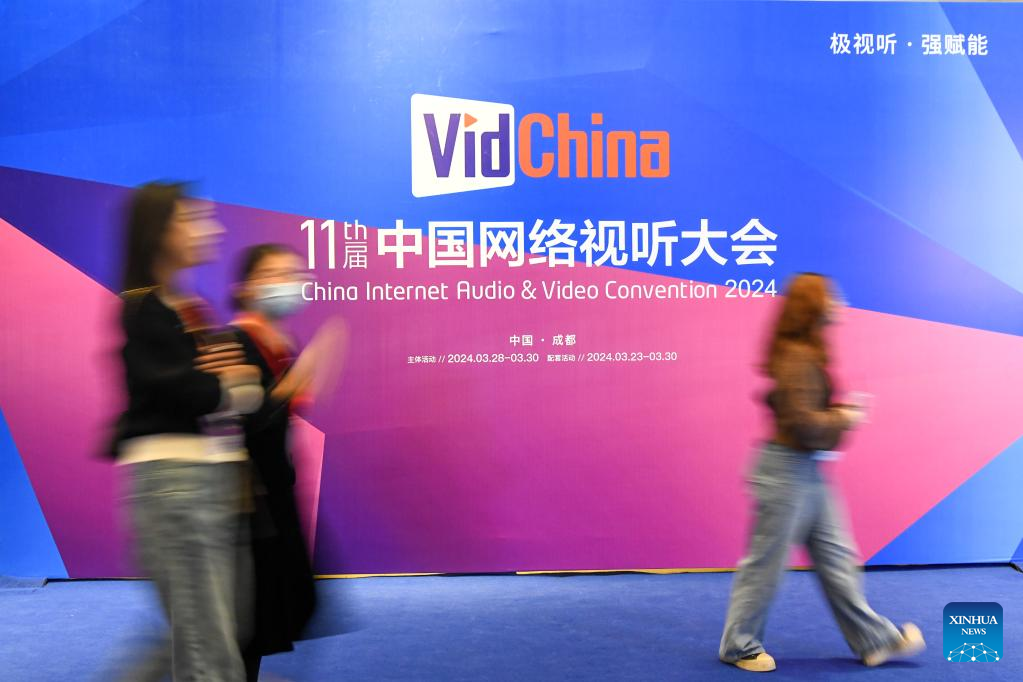 Participants walk past a signboard of the 11th China Internet Audio and Video Convention in Chengdu, southwest China's Sichuan Province, March 28, 2024. The 11th China Internet Audio and Video Convention, demonstrating a series of cutting-edge technologies, opened on Thursday in Chengdu, capital of southwest China's Sichuan Province. Focusing on innovation and industrial upgrades, the three-day event has attracted participating enterprises to display their technologies in 5G+8K, 3D, cloud gaming and other sectors. (Xinhua/Tang Wenhao)