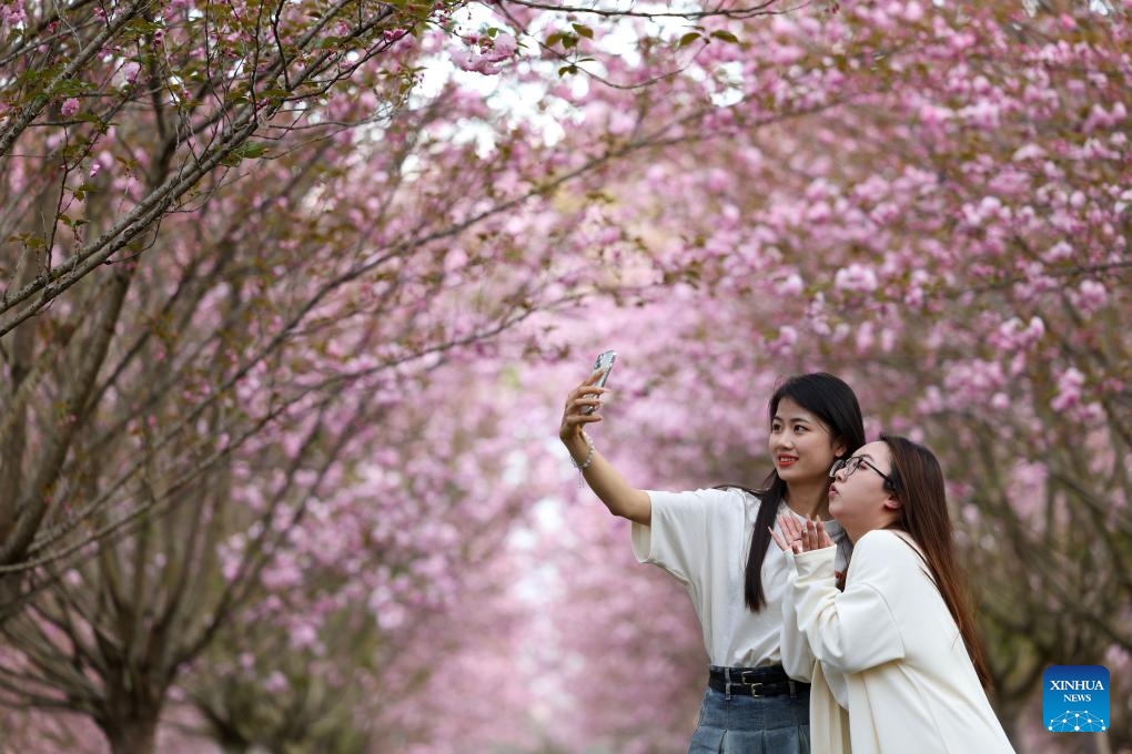 People take photos at a scenic area in Chahe Town of Bijie, southwest China's Guizhou Province, March 28, 2024. The warm weather and blooming flowers are attracting people out of their homes to enjoy the spring. (Photo by Mao Yuanhui/Xinhua)