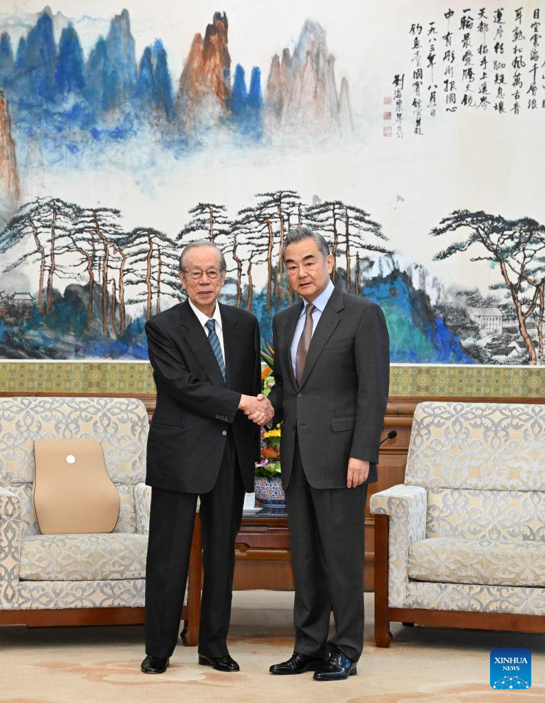 Wang Yi, a member of the Political Bureau of the Communist Party of China Central Committee and Chinese Foreign Minister, meets with Yasuo Fukuda, former Japanese Prime Minister and former chairman of the Boao Forum for Asia, in Beijing, capital of China, March 29, 2024. (Xinhua/Zhang Ling)