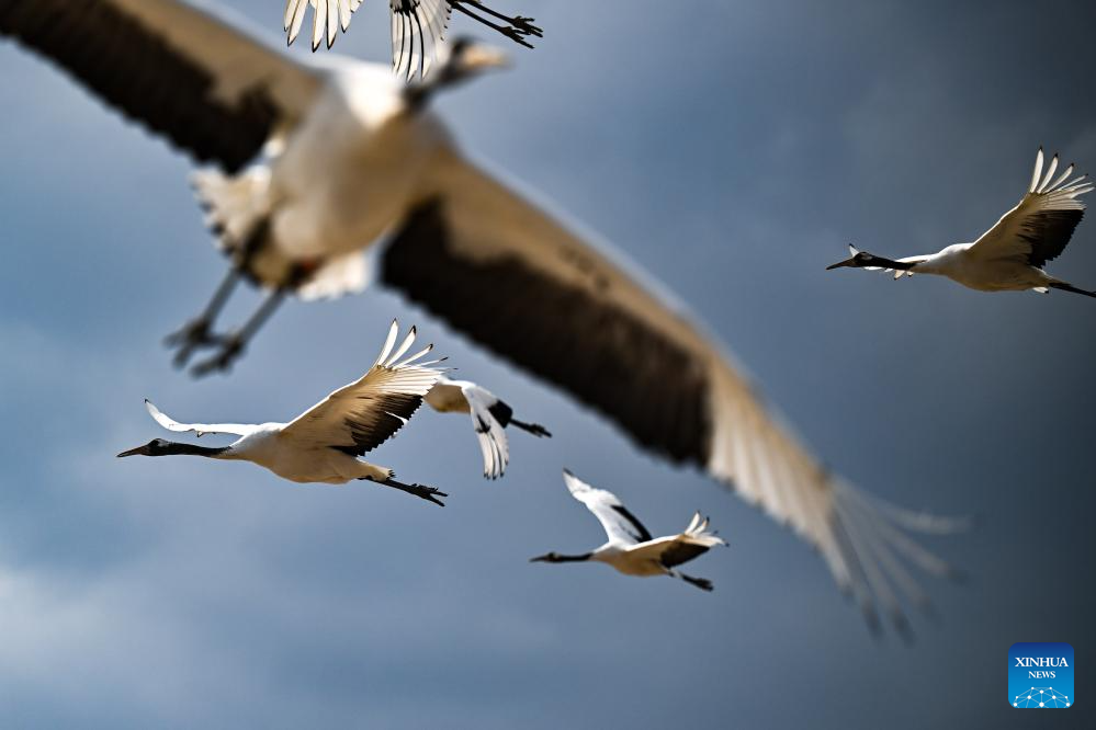 Red-crowned cranes fly at Zhalong National Nature Reserve in Qiqihar, northeast China's Heilongjiang Province, March 29, 2024. Zhalong National Nature Reserve provides a major habitat for red-crowned cranes and other wildlife. (Xinhua/Chen Yichen)
