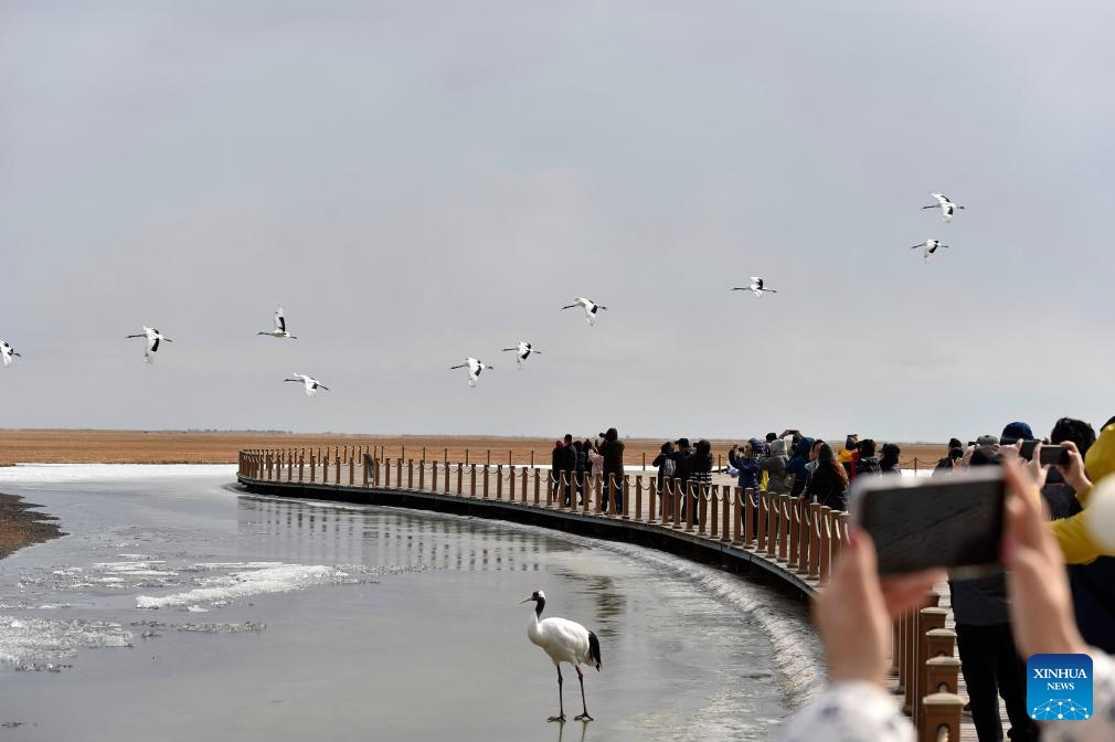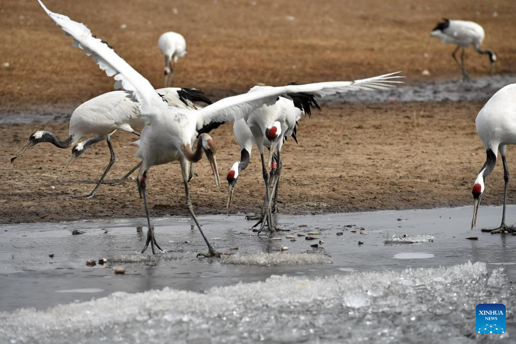 Red-crowned cranes are seen at Zhalong National Nature Reserve in Qiqihar, northeast China's Heilongjiang Province, March 29, 2024. Zhalong National Nature Reserve provides a major habitat for red-crowned cranes and other wildlife. (Xinhua/Ding He)
