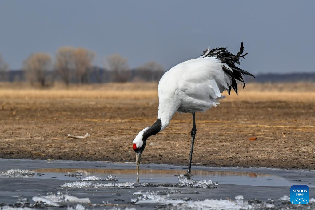 A red-crowned crane is seen at Zhalong National Nature Reserve in Qiqihar, northeast China's Heilongjiang Province, March 29, 2024. Zhalong National Nature Reserve provides a major habitat for red-crowned cranes and other wildlife. (Xinhua/Chen Yichen)