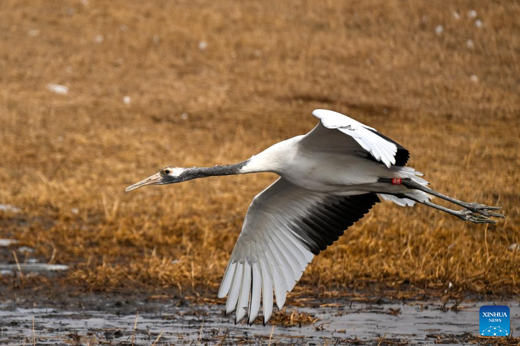 A red-crowned crane flies at Zhalong National Nature Reserve in Qiqihar, northeast China's Heilongjiang Province, March 29, 2024. Zhalong National Nature Reserve provides a major habitat for red-crowned cranes and other wildlife. (Xinhua/Chen Yichen)