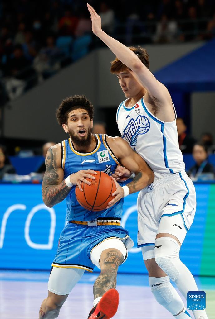 Dominique Jones (L) of Xinjiang Flying Tigers competes during the 50th round match between Jilin Northeast Tigers and Xinjiang Flying Tigers at the 2023-2024 season of the Chinese Basketball Association (CBA) league in Urumqi, northwest China's Xinjiang Uygur Autonomous Region, March 31, 2023. (Xinhua/Hu Huhu)
