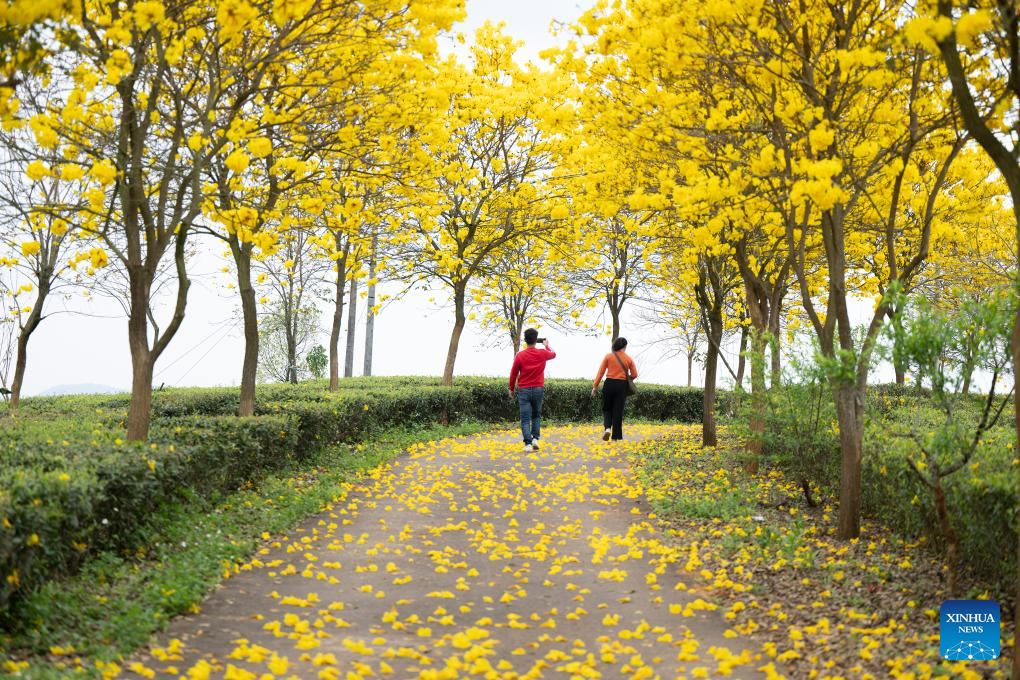 Tourists view tabebuia chrysantha blossoms in Cangwu County of Wuzhou City, south China's Guangxi Zhuang Autonomous Region, March 27, 2024. (Photo by He Huawen/Xinhua)