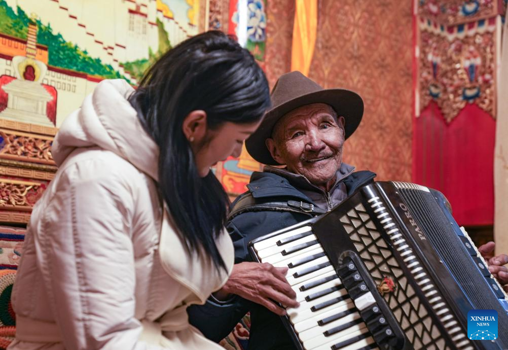 Namgyal plays the accordion with his granddaughter aside at his home in Doilungdeqen District of Lhasa, southwest China's Xizang Autonomous Region, March 13, 2024.