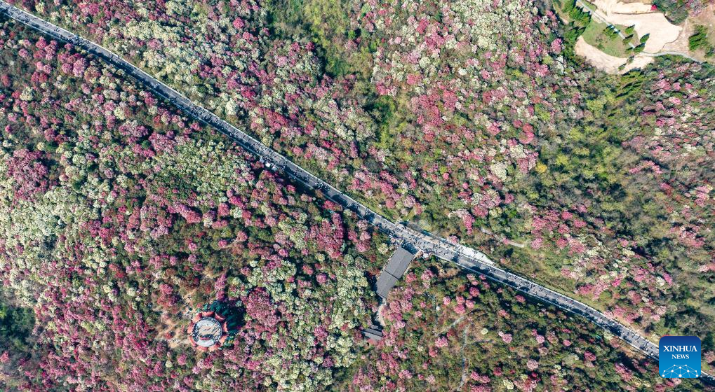 An aerial drone photo taken on March 29, 2024 shows tourists visiting an azalea scenic area in Bijie, southwest China's Guizhou Province. (Xinhua/Tao Liang)