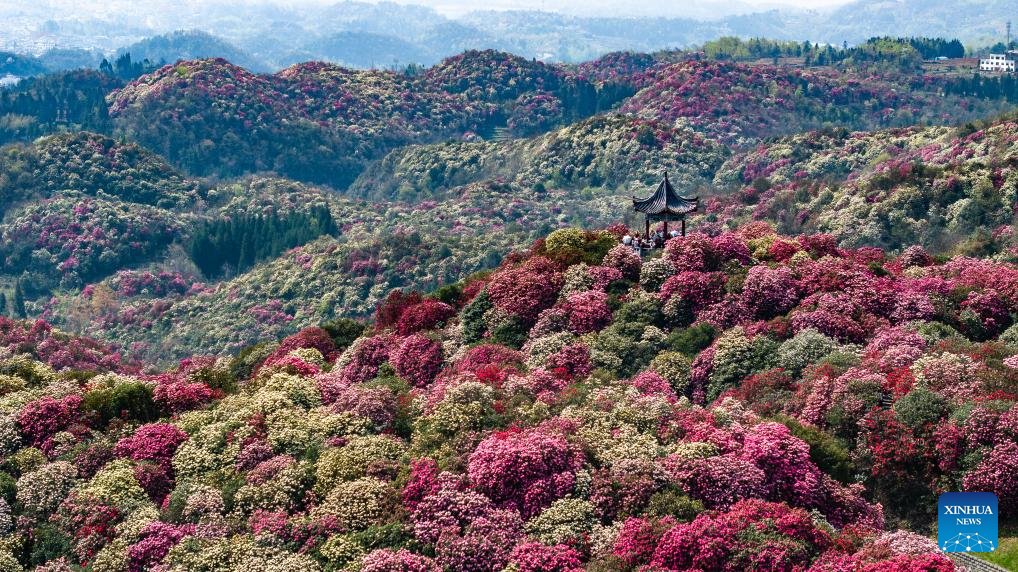 An aerial drone photo taken on March 30, 2024 shows a view of an azalea scenic area in Bijie, southwest China's Guizhou Province. (Xinhua/Tao Liang)