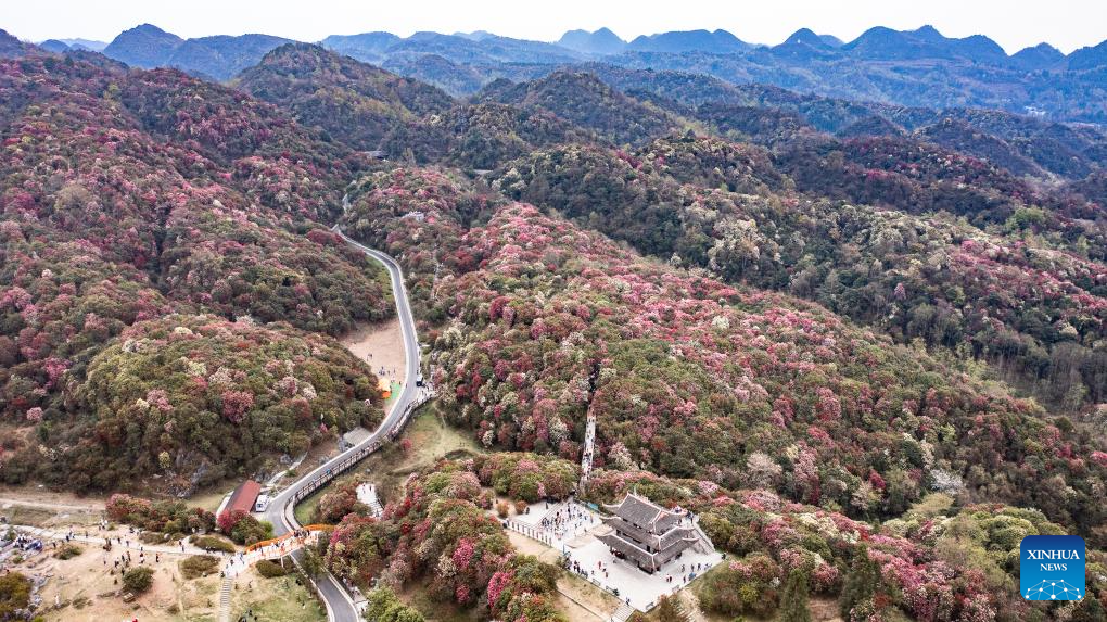 An aerial drone photo taken on March 30, 2024 shows tourists visiting an azalea scenic area in Bijie, southwest China's Guizhou Province. (Xinhua/Tao Liang)