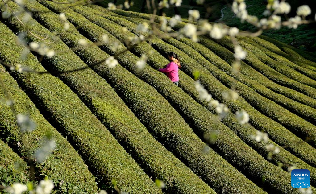 A farmer picks tea leaves at a tea garden in Zouma Town of Hefeng County, central China's Hubei Province, March 29, 2024. The county of Hefeng has made efforts in the coordinated development of tea planting and tourism industries to boost rural revitalization. (Photo by Yang Shunpi/Xinhua)