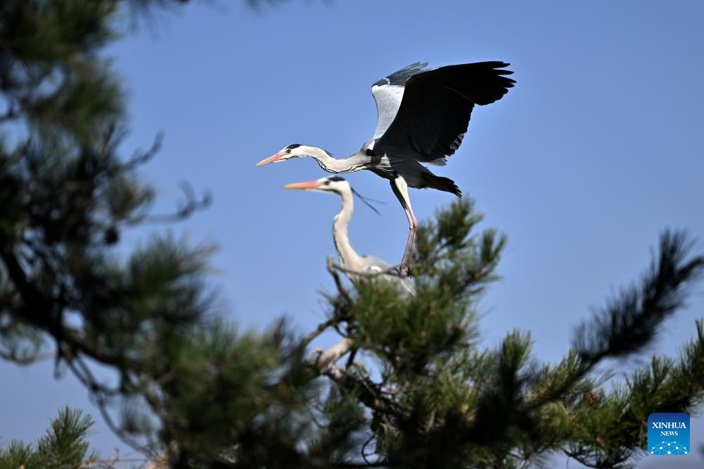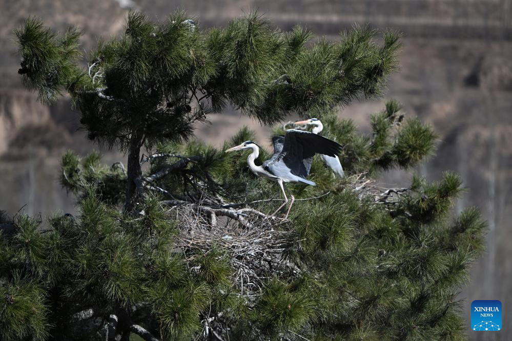 Herons perch on the branch in Jicui Town of Fangshan County, Lyuliang City, north China's Shanxi Province, March 29, 2024. A flock of herons migrate to the town to build nests and breed in the spring. (Xinhua/Zhan Yan)