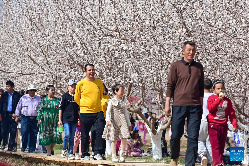 People view blooming apricot flowers during a cultural and tourism event held in Yaha Township of Kuqa County, northwest China's Xinjiang Uygur Autonomous Region, March 30, 2024. In recent years, local authorities of Kuqa have vigorously promoted large-scale and standardized apricot planting to increase income for local villagers. (Xinhua/Ding Lei)