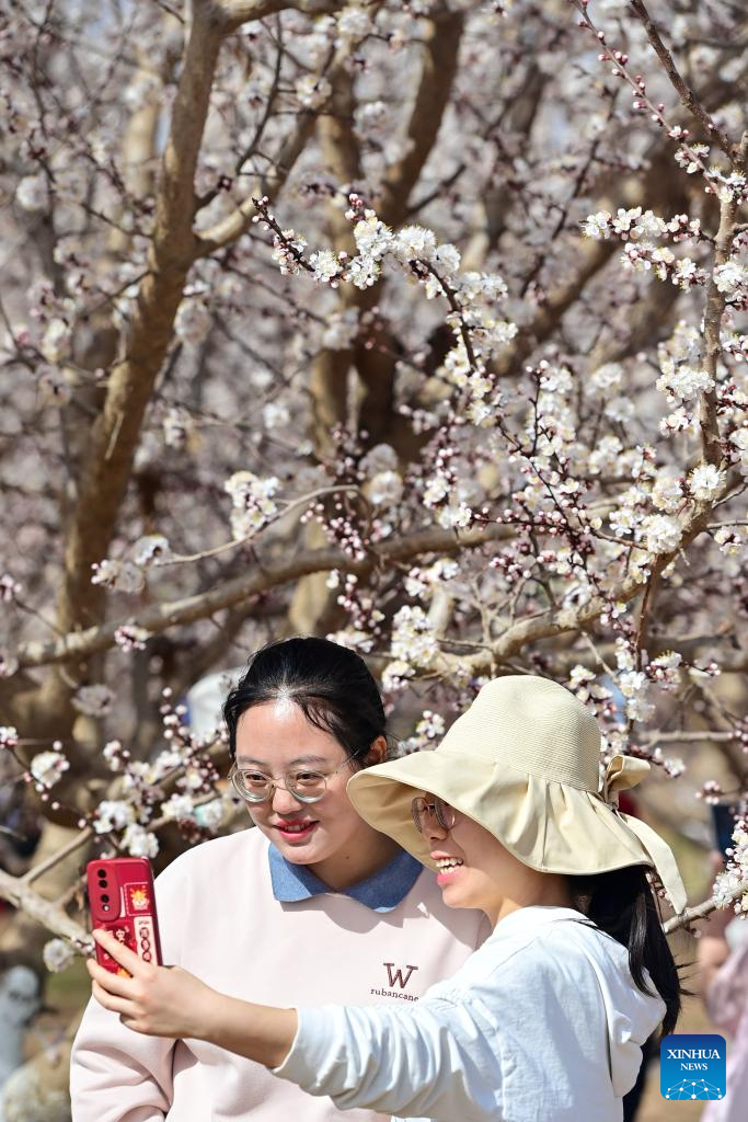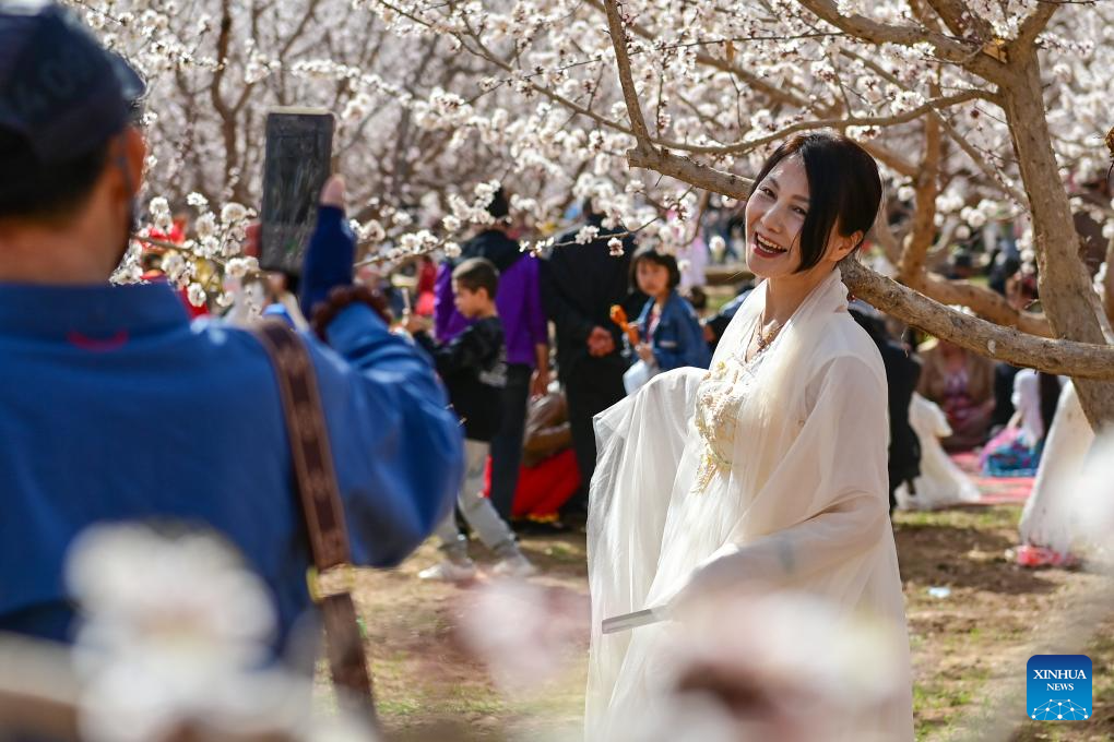 Tourists pose for photos in front of blooming apricot flowers during a cultural and tourism event held in Yaha Township of Kuqa County, northwest China's Xinjiang Uygur Autonomous Region, March 30, 2024. In recent years, local authorities of Kuqa have vigorously promoted large-scale and standardized apricot planting to increase income for local villagers. (Xinhua/Ding Lei)