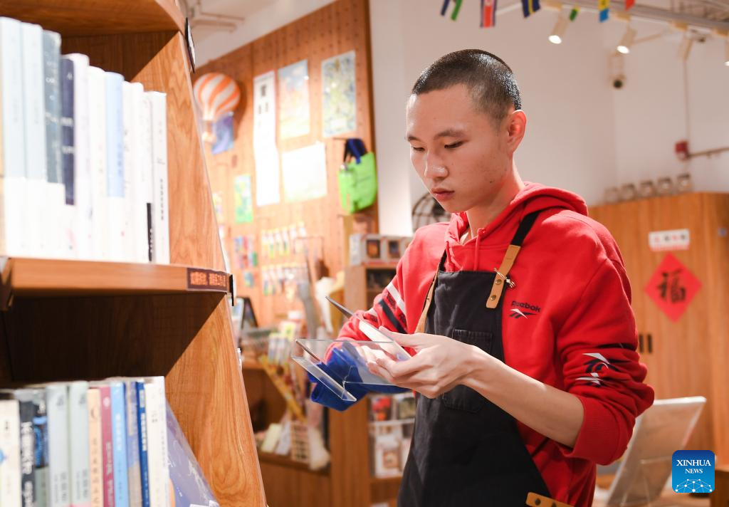 Pan Yikai, a 23-year-old autistic youth, works at a bookstore in Shenzhen, south China's Guangdong Province, March 20, 2024. He has been working part-time at the bookstore since May 2022 for 2 to 3 hours a day, responsible for wiping and arranging book shelves and cleaning the floor. This Tuesday marks the 17th World Autism Awareness Day. In south China's Shenzhen, some autistic youth, who were called "children of the stars," have integrated into society and are chasing their dreams.?(Xinhua/Mao Siqian)